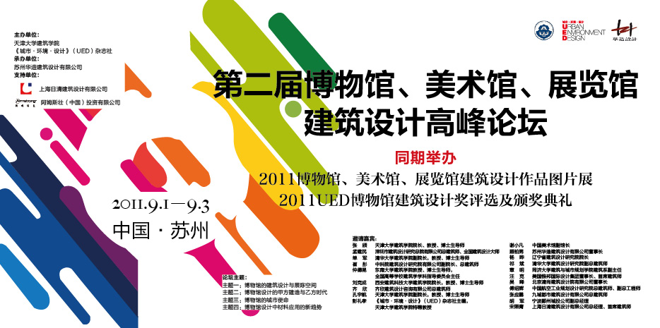 2009年12月,由《城市·環(huán)境·設(shè)計》(UED)雜志社主辦的“第一屆博物館、美術(shù)館、展覽館建筑設(shè)計高峰論壇”在北京成功舉辦,崔愷、朱锫、王輝、馬巖松、崔彤、劉珩等中國知名建筑師蒞臨現(xiàn)場,并結(jié)合各自的創(chuàng)作實踐進(jìn)行了精彩演講。