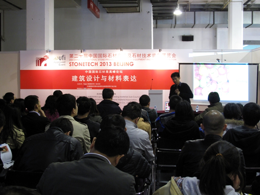 2013年4月18日,《建筑技藝》雜志與中國國際貿(mào)易促進(jìn)委員會建筑材料行業(yè)分會共同主辦,“建筑設(shè)計(jì)與材料論壇”在北京國家展覽館舉行,來自墨臣建筑設(shè)計(jì)有限公司的賴軍、中國建筑設(shè)計(jì)研究院曹曉昕、維思平建筑設(shè)計(jì)公司的張瑛,分別作了主題報告。賴軍先生以織造/筑造為題,一句“服裝是穿在身上的建筑”,從服裝的織造、印花、鏤空、刺繡、層疊、編織對應(yīng)于墨臣的每個設(shè)計(jì),生動地展示了每個建筑中材料的筑造之美。曹曉昕則從內(nèi)蒙古巴彥淖爾市中學(xué)的磚、教學(xué)辦公樓的白色涂料、到自己工作室中繪圖硫酸紙、線腳、GRC混凝土的運(yùn)用,以及設(shè)計(jì)師工作包,講述了不同材料在設(shè)計(jì)中的巧妙運(yùn)用。張瑛設(shè)計(jì)師將維思平的眾多設(shè)計(jì)梳理,以其中各具特色的光教堂、石院、南京長發(fā)中心的面紗、北京用友員工交流中心的木拱等,從無形的自然光、有形的材料到彩色涂料,全面介紹了維思平在設(shè)計(jì)中對材料的獨(dú)特表達(dá)。可以說,三位設(shè)計(jì)師的演講各具特色,給在場聽眾帶來材料應(yīng)用的新方法、新思路。