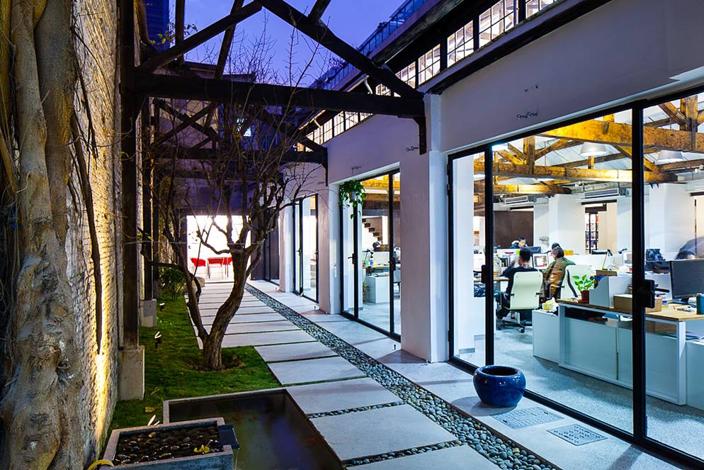 章明:以新近完成并搬遷的原作設(shè)計(jì)工作室為例,講述了一個(gè)連做倉(cāng)庫(kù)都被嫌棄的上海鞋釘廠(chǎng)老廠(chǎng)房,經(jīng)設(shè)計(jì)師的妙手化腐朽為神奇。利用混凝土密封固化劑整理地坪,保留青磚墻面和木屋架,白水泥材料輔以陰刻字被應(yīng)用于桌面,木材以燕尾榫拼接設(shè)計(jì)的會(huì)議桌,自行設(shè)計(jì)并安裝的鍍鋅水管燈,植物、水面組成的庭院向工作空間開(kāi)放……原有的老廠(chǎng)房依稀可見(jiàn),但已完全換做新的功能。