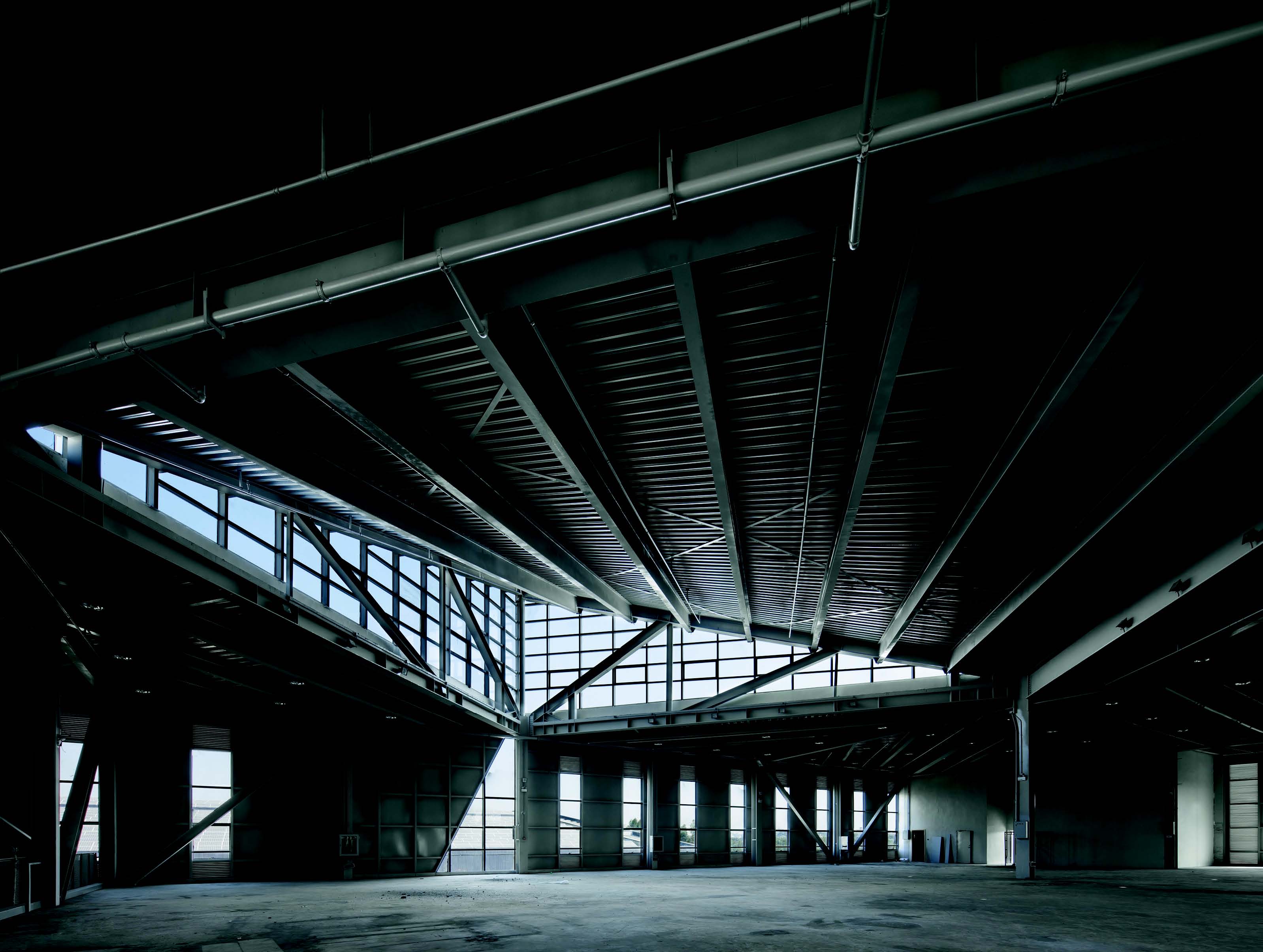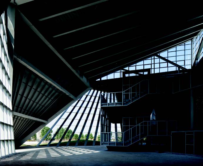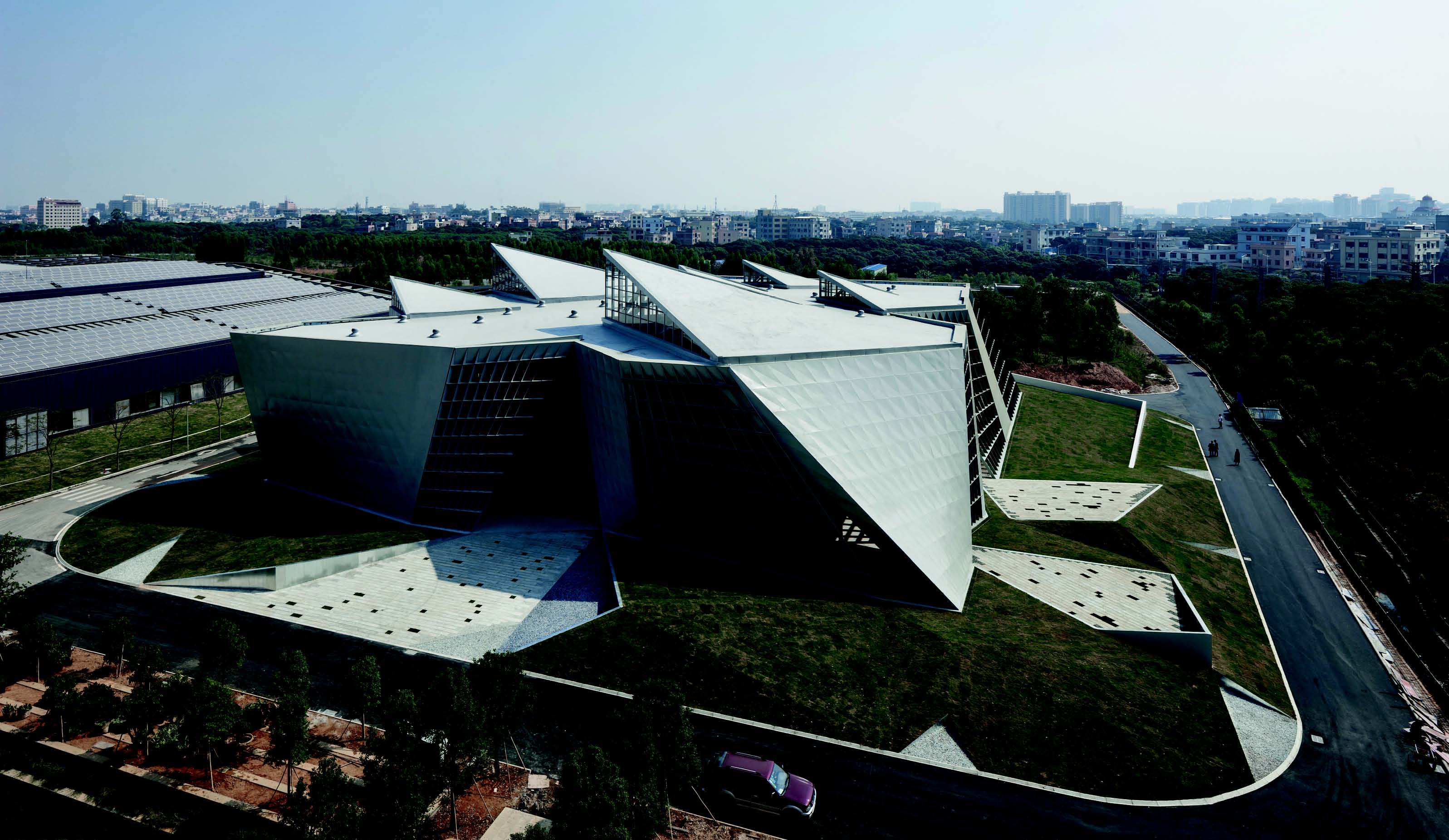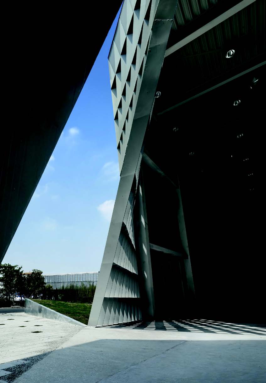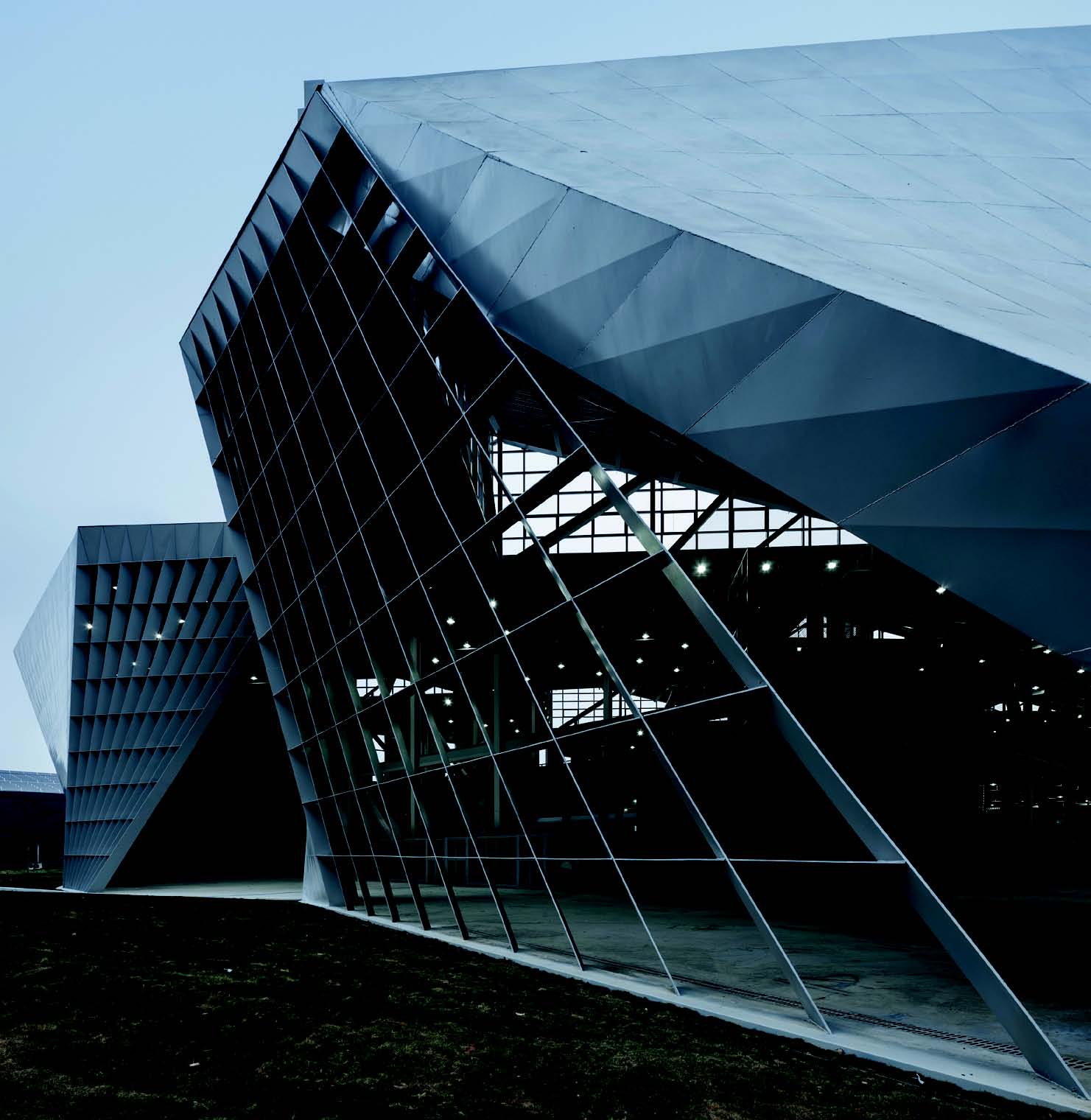 萬科創(chuàng)展中心位于東莞松山湖萬科集團住宅產(chǎn)業(yè)化研究基地內(nèi),是萬科集團住宅建筑設(shè)計、住宅精裝修研發(fā)與展示的基地。內(nèi)部要求14m柱跨的通用空間。用地北部為已建成的研究廠房,南側(cè)為基地邊界的自然土坡。結(jié)合內(nèi)部空間要求和外部環(huán)境,創(chuàng)展中心由14m柱跨的方盒子開始,將屋頂及東側(cè)、南側(cè)的墻體撕裂、扭轉(zhuǎn),形成光線和空氣進入建筑的通道。扭轉(zhuǎn)的墻體虛實相間,分別轉(zhuǎn)化為封閉的曲面鋼幕墻和扭曲的鋼格柵。支撐斜柱隱藏在曲面幕墻內(nèi),鋼格柵在增強通風效果的同時,也作為遮陽構(gòu)件起到遮陽作用。兩者虛實相間形成的豐富形體與南側(cè)自然地形相呼應(yīng)。為了實現(xiàn)這一設(shè)計構(gòu)思,從幾何形態(tài)、參數(shù)化設(shè)計技術(shù)、構(gòu)造節(jié)點等方面提出了相應(yīng)的措施。