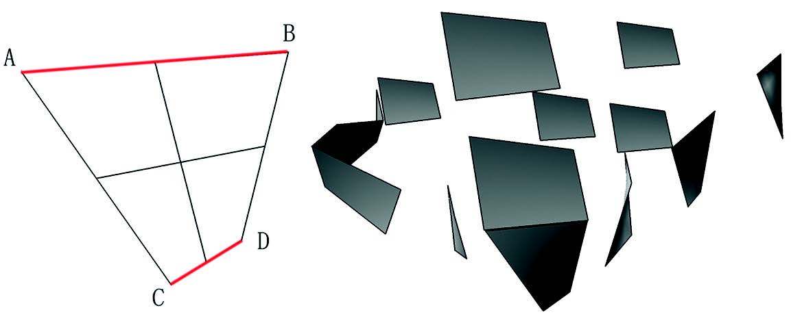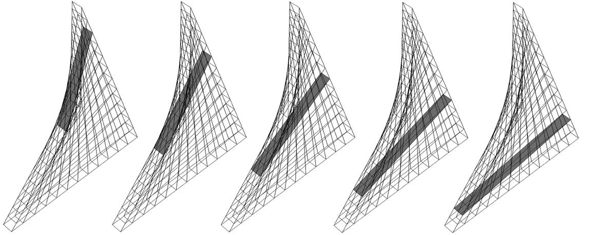 非標準構(gòu)件的幾何形體如果在三維方向同時變化,需要進行三維數(shù)控加工,造價高昂。如果將非標準構(gòu)件的形狀變化限定在二維平面內(nèi),其造價就會大幅降低。走訪本地加工廠發(fā)現(xiàn),很多常規(guī)的直線形構(gòu)件也采用數(shù)控加工,數(shù)控加工技術(shù)的普及為設(shè)計的實現(xiàn)提供了現(xiàn)實基礎(chǔ)。在加工費用上,以數(shù)控切割機為例,加工平面內(nèi)的曲線形構(gòu)件與加工直線形構(gòu)件單位時間的加工費相同,不同之處在于材料的利用率。根據(jù)這一加工條件,創(chuàng)展中心將構(gòu)件形狀變化限制在二維平面內(nèi),同時利用合理的幾何選型,將構(gòu)件進一步簡化為直線形構(gòu)件,提高了材料利用率,降低了總體造價。在多種自由曲面類型中,滿足這一要求的是由空間中不共面的兩條直線定義的規(guī)則曲面,而沿兩條邊等分線的連線均為直線。這一特性方便了后期加工,建造過程中的定位也比較方便。規(guī)則曲面的弱點在于形態(tài)變化不夠豐富,因此創(chuàng)展中心采用多組規(guī)則曲面的組合,構(gòu)成豐富的形態(tài)變化。