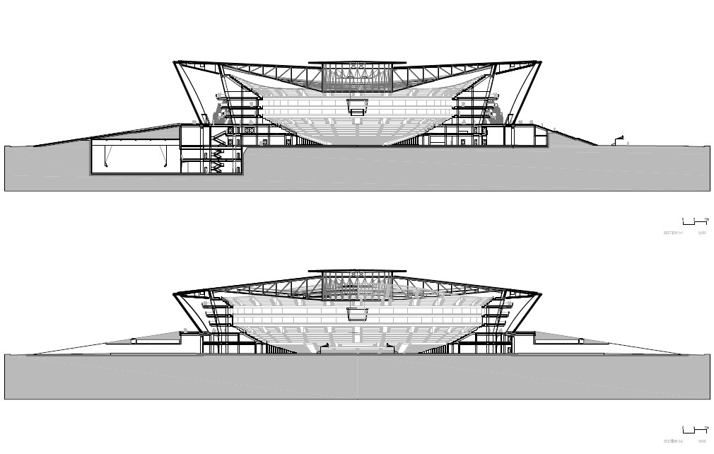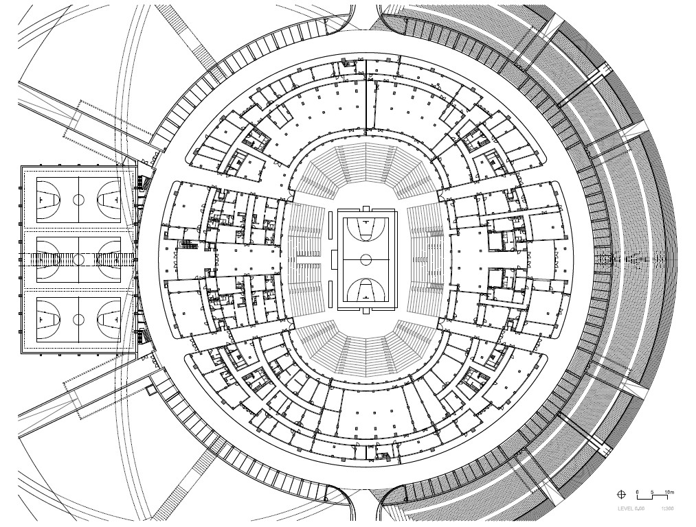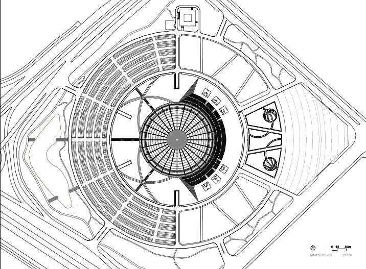 體育館為一個(gè)大型公園所環(huán)抱,是喧鬧的大街到體育館之間的緩沖地帶。公園綠地的規(guī)劃采用了與體育場(chǎng)造型的元素。寬闊的綠化帶、水邊蜿蜒的小徑圍繞著體育館四周,提供了理想的室外運(yùn)動(dòng)休閑場(chǎng)地。