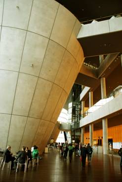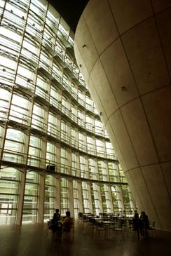 位于東京六本木的國立新美術(shù)館,建筑面積為47,960平方米,是日本國內(nèi)展廳最大的美術(shù)館。黑川紀(jì)章在日本建筑界更像一位思想家,不管他的“新陳代謝“理論還是”空“理論、“灰”理論都在當(dāng)時(shí)的建筑界起到思想旋風(fēng)的作用,同樣他在國立美術(shù)館設(shè)計(jì)尋找自己最完美的答案的時(shí)候融入了自己的“共生思想”的設(shè)計(jì)理念,大塊的規(guī)整的展覽空間并沒有妨礙整個(gè)建筑具有自己鮮明的特色,相反,外表“利休灰”的色彩搭配更好的烘托出曲面玻璃圍合出的共享大廳,使人們體驗(yàn)到這種室內(nèi)外的空間滲透,使門廳具有混淆室內(nèi)外的微妙空間效果,人們透過玻璃可以望見太陽、云彩和天空,建筑顯得平實(shí)、含蓄更接近人性。