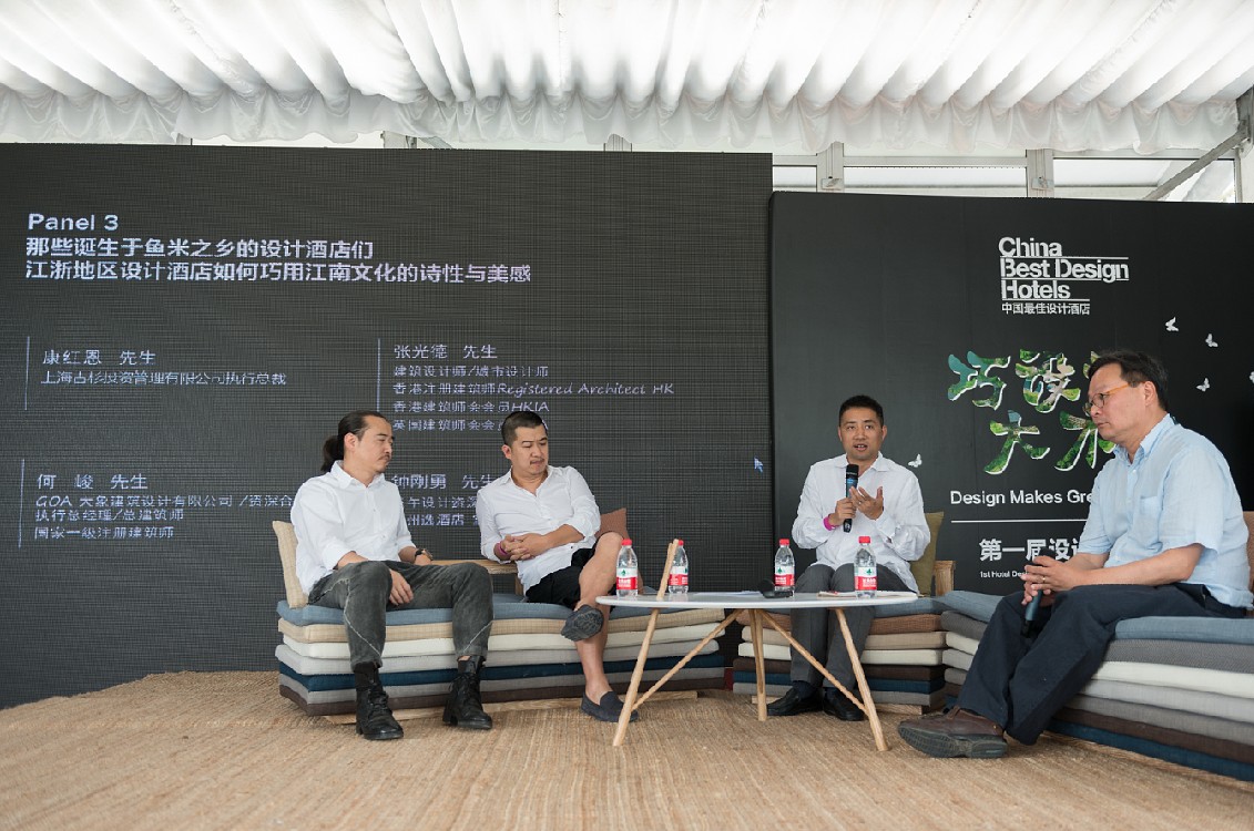 第三個圓桌討論議題“那些誕生于魚米之鄉(xiāng)的設(shè)計酒店們”邀請了上海古杉投資管理有限公司執(zhí)行總裁康紅恩、建筑設(shè)計師張光德、GOA資深合伙人及總建筑師何峻、正午設(shè)計資深合伙人鐘剛勇,從酒店業(yè)主“甲方”的需求和設(shè)計師“乙方”的實施進(jìn)行激烈討論,提出應(yīng)當(dāng)摒棄局限于“江南”地區(qū)酒店的發(fā)展,從宏觀的角度探討了酒店項目在各個設(shè)計環(huán)節(jié)所遇到的實際問題。