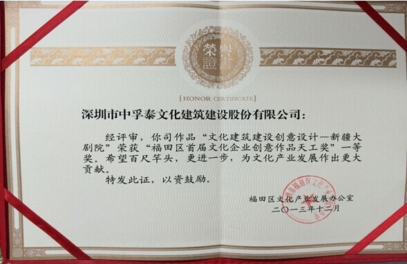 中孚泰作品:新疆大劇院榮獲“福田區(qū)首屆文化企業(yè)創(chuàng)意作品天工獎”