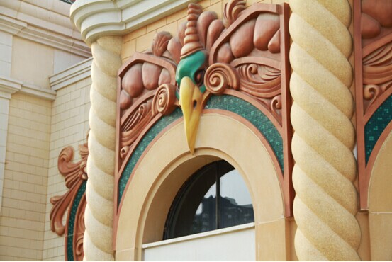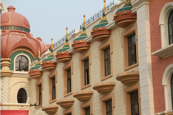 據(jù)悉,在這個占地面積超過21萬方的巨大建筑工地里,由南京倍立達(dá)公司承建的GRC外墻顯得格外耀眼,橙紅色的球?qū)毼蓓敗⑸罹G色的恐龍模型,惟妙惟肖、氣勢磅礴,加之靚麗的色彩使恐龍王國的童話韻味更加鮮明。