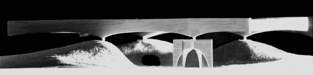 長(zhǎng)50m、寬32.5m的巨大屋蓋由非正交網(wǎng)格上的4個(gè)點(diǎn)支撐在屋頂?shù)倪吘壧帲⒎怯脗鹘y(tǒng)的方式支撐,而在平坦的地面上用混凝土修飾出三座 “山丘”, 其中3根柱子隱藏在 “山丘”中。建筑師創(chuàng)造了一個(gè)假象,仿佛支撐屋頂?shù)牟皇墙Y(jié)構(gòu),而是場(chǎng)地。除了場(chǎng)地內(nèi)凸起的三座“小山”支撐,建筑師還加入了一個(gè)由兩個(gè)圓拱垂直相交構(gòu)成的支撐,成為了場(chǎng)地上唯一的豎直元素,這也是地表上唯一清晰可見(jiàn)的支撐構(gòu)件。