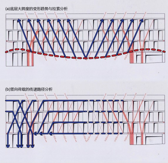 使用較重的混凝土之后,對(duì)支座的拉力會(huì)使其底部產(chǎn)生巨大的傾覆力矩。為此,巴爾蒙德在兩端的剪力墻上設(shè)置了一系列垂直的鰭狀片墻抵抗側(cè)向的拉力,并在地下采用了一系列橫穿整個(gè)跨度的地梁來(lái)連接兩端的基礎(chǔ)。地梁起到了拉桿的作用,把所有的構(gòu)件連接在一起形成了一個(gè)完整的荷載回路,位于空中的拉力與地下的反推力形成閉合,并與支座相連。
