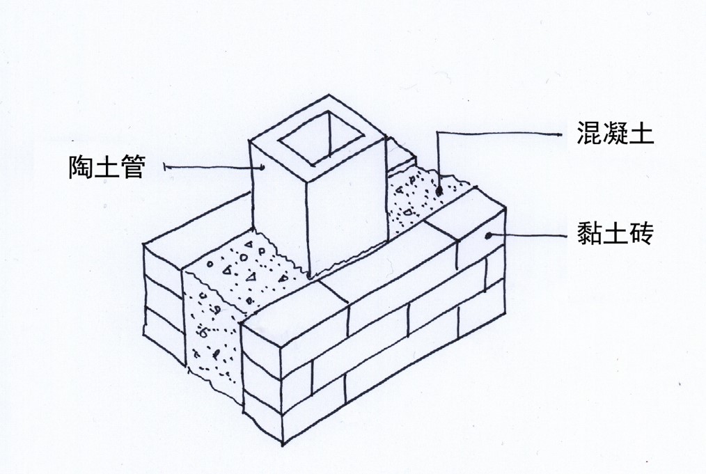 現(xiàn)澆混凝土結(jié)構(gòu)的層與層之間通過(guò)“陶土管”結(jié)合:陶土管的一端預(yù)埋在下層的混凝土中,當(dāng)混凝土凝固之后,繼續(xù)砌筑磚墻,上一層的混凝土將淹沒(méi)陶土管的另一端,陶土管的作用類似于預(yù)留鋼筋。