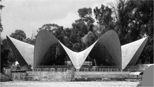 霍奇米爾科水上公園餐廳是由費(fèi)利克斯?坎德拉設(shè)計(jì)的殼體式建筑,四個(gè)相交的雙曲拋物面形成的八角形交叉拱向四周展開(kāi),采用無(wú)梁柱薄殼結(jié)構(gòu),輕盈的形體巧妙地融入景物之中。