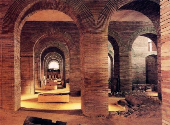 古羅馬藝術(shù)博物館位于西班牙梅里達(dá),處于廢墟之上。莫內(nèi)歐為實(shí)現(xiàn)新舊建筑之間的完美共存,摒棄了用大跨結(jié)構(gòu)跨越廢墟的做法,將混凝土這種強(qiáng)度較大的填充粘結(jié)材料澆筑在兩面薄且平的磚墻之間,即用磚砌成雙層拱圈,爾后在其中澆筑混凝土,最終形成復(fù)合結(jié)構(gòu)從而實(shí)現(xiàn)較大的跨度。磚墻作為“永久模板”保留在混凝土的外表,在獲得高強(qiáng)度的同時(shí)也保留了磚建筑細(xì)膩的肌理感和清晰的建構(gòu)邏輯。