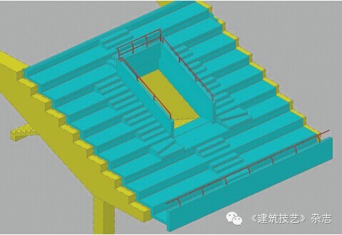 在深化設(shè)計(jì)前,我院分別建立現(xiàn)澆主體結(jié)構(gòu)模型和預(yù)制看臺(tái)模型,將兩個(gè)建好的模型進(jìn)行組合套圖,查找預(yù)制看臺(tái)系統(tǒng)和現(xiàn)澆主體結(jié)構(gòu)有無(wú)相碰或不交圈的部位,該方法對(duì)于出入口等空間結(jié)構(gòu)復(fù)雜的位置檢查非常必要(圖15~20)。