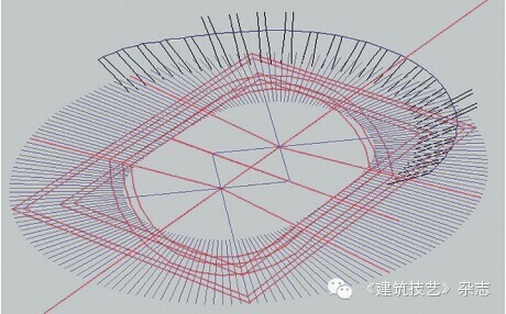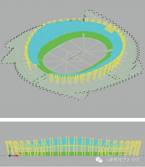 此項(xiàng)目工期短、難度大,從設(shè)計(jì)、施工到構(gòu)件加工、現(xiàn)場(chǎng)裝配都有難度,再加上設(shè)計(jì)院前期提供的圖紙不是很完善,只有體育場(chǎng)整體模型(圖13),尤其是二層看臺(tái)現(xiàn)澆階梯梁平面布置復(fù)雜,平面投影呈折線形,設(shè)計(jì)院結(jié)構(gòu)專業(yè)沒有定位圖,提供的計(jì)算模型導(dǎo)出圖(圖14)可以作為參考,但不能作為指導(dǎo)深化設(shè)計(jì)的依據(jù),所以此現(xiàn)澆階梯型折線梁的空間定位