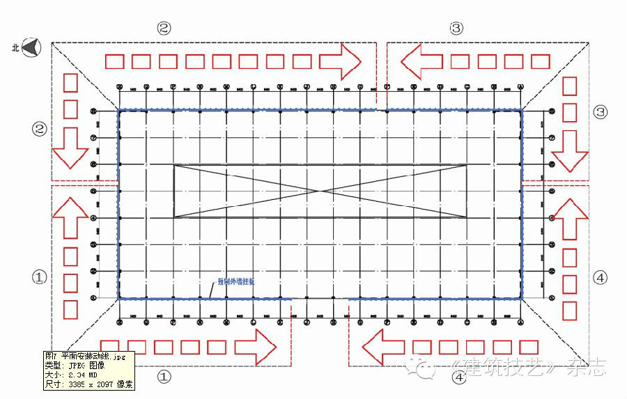 由于該項(xiàng)目建筑平面尺寸較大墻板的水平向和豎向均采用企口接縫。外掛板的安裝順序非常關(guān)鍵,設(shè)計(jì)階段應(yīng)考慮掛板安裝順序,豎向要求從低到高逐層安裝,水平向應(yīng)從四個(gè)角點(diǎn)向中間安裝,經(jīng)過(guò)反復(fù)研究和優(yōu)化,制訂平面安裝動(dòng)線(圖7)。