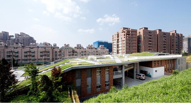 許智凱分享了他做過(guò)的臺(tái)灣桃園市大有消防分隊(duì)設(shè)計(jì)案例,以及現(xiàn)有制度下消防隊(duì)如何與社區(qū)、環(huán)境和生活更積極的互動(dòng)。大有消防站基地旁邊有個(gè)局部開(kāi)建的公園,后方有一座寺廟,因此在建設(shè)時(shí),希望可以降低建筑物對(duì)公園的影響,尊重寺廟的視界,并且讓公眾利用建筑的大屋頂。建筑完成后,就想隱身在公園下方,在不影響消防工作的前提下創(chuàng)造與環(huán)境雙贏。