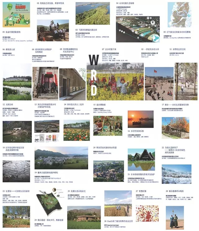 展覽精選了來自中國、美國、荷蘭、比利時、意大利、韓國、日本、臺灣等國家(地區(qū))的相關(guān)八類機構(gòu)遞交的三十個項目。第一類是由高校聯(lián)動的設(shè)計研究機構(gòu):如北京大學(xué)俞孔堅教授領(lǐng)銜的土人設(shè)計、清華大學(xué)羅德胤教授領(lǐng)銜的傳統(tǒng)村落研究團(tuán)隊、清華大學(xué)藝術(shù)與科學(xué)研究中心劉新教授領(lǐng)銜的“可持續(xù)生活實驗室”、中央美術(shù)學(xué)院何崴教授領(lǐng)銜的團(tuán)隊、香港中文大學(xué)吳恩融教授領(lǐng)銜的團(tuán)隊、西安建筑科技大學(xué)穆鈞教授領(lǐng)銜的土上建筑工作室、中國美院陳浩如教授領(lǐng)銜的山上建筑設(shè)計事務(wù)所、比利時魯汶大學(xué)建筑學(xué)系相關(guān)研究團(tuán)隊、韓國首爾大學(xué)環(huán)境學(xué)院相關(guān)研究團(tuán)隊、住建部村鎮(zhèn)司現(xiàn)代生土建筑實驗室相關(guān)研究團(tuán)隊等;第二類是國內(nèi)傳統(tǒng)大型設(shè)計機構(gòu):如北京清華同衡規(guī)劃設(shè)計研究院有限公司、北京國文琰文化遺產(chǎn)保護(hù)中心有限公司、北京易肯建筑規(guī)劃設(shè)計設(shè)計有限公司等;第三類是以個人魅力為特色的鄉(xiāng)建先鋒:如綠十字的孫君、共享社區(qū)發(fā)展中心的牛健、智慧草原的李曉秋等;第四類是在鄉(xiāng)村設(shè)計上具有國際聲譽的境外設(shè)計機構(gòu):如美國SWA GROUP、比利時RLKM、荷蘭VISTA等;第五類是具有國際視野并且堅持本土創(chuàng)作的設(shè)計工作室:如比利時BUUR、臺灣劉國滄打開聯(lián)合文化創(chuàng)意有限公司、意大利B.OND等;第六類是具有產(chǎn)業(yè)創(chuàng)新思維的商業(yè)機構(gòu):如路野路亞、北京世紀(jì)唐人旅游發(fā)展有限公司等;第七類是相關(guān)專業(yè)媒體媒體:如景觀中國網(wǎng)站、《景觀設(shè)計學(xué)》雜志培訓(xùn)考察交流中心等;第八類是熱衷鄉(xiāng)村事業(yè)的NGO:如AIM、中國扶貧基金會、無止橋慈善基金等。