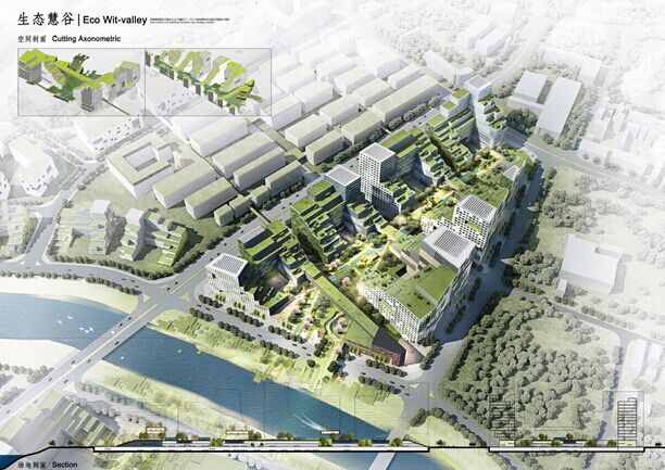 設(shè)計(jì)說明:我們結(jié)合自然水體以及城市肌理,考慮多種功能的需求以及復(fù)雜的交通形式,引入了一條橫向的復(fù)合型城市中軸;通過退臺以及半圍合建筑形態(tài)打造多層次屋頂綠化空間和下沉庭院空間;復(fù)合軸將多個(gè)退臺式庭院串聯(lián),營造出承載了生態(tài)景觀、綠色交通、生產(chǎn)及生活性服務(wù)的活力共享空間——“生態(tài)慧谷”。