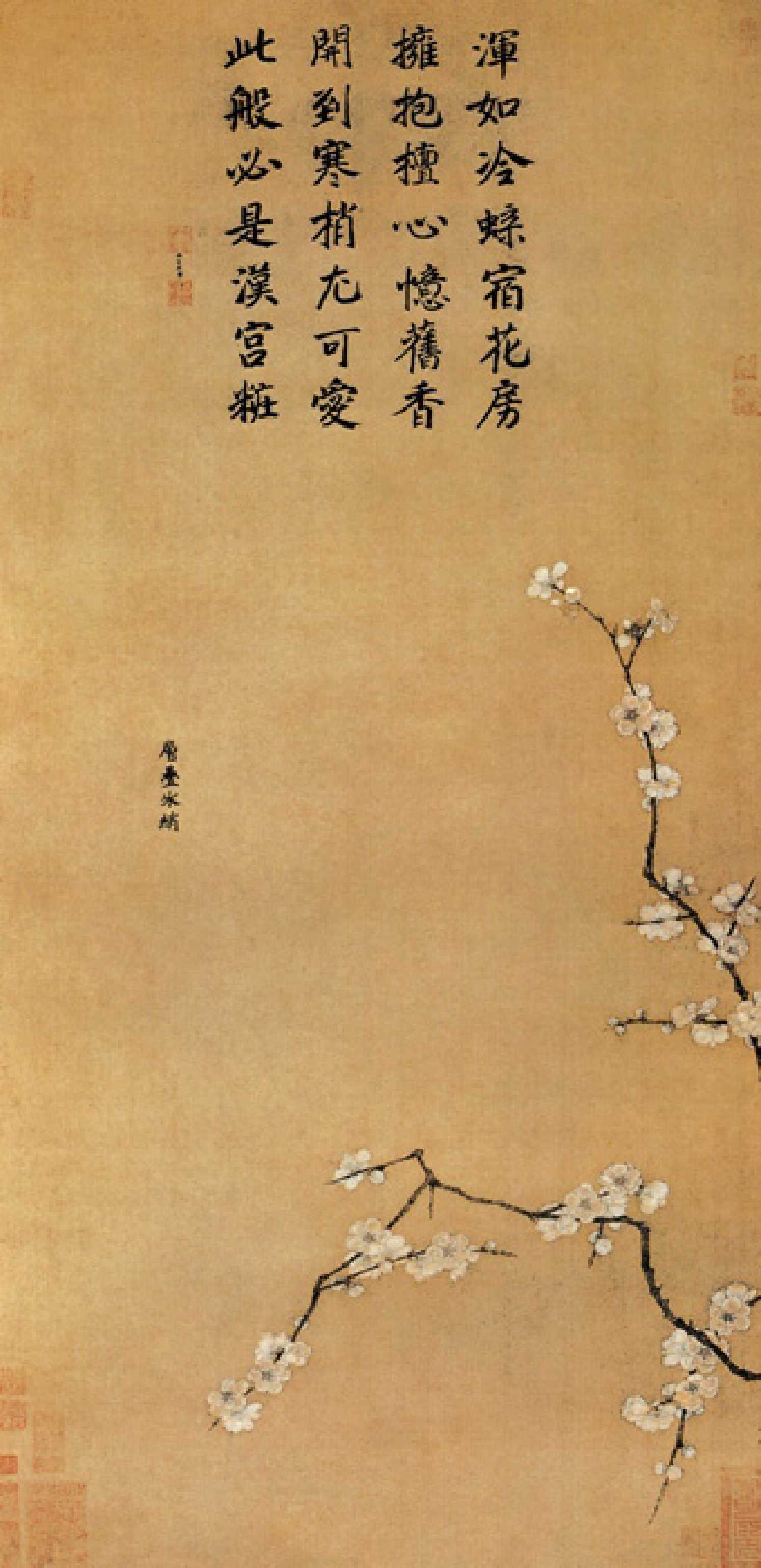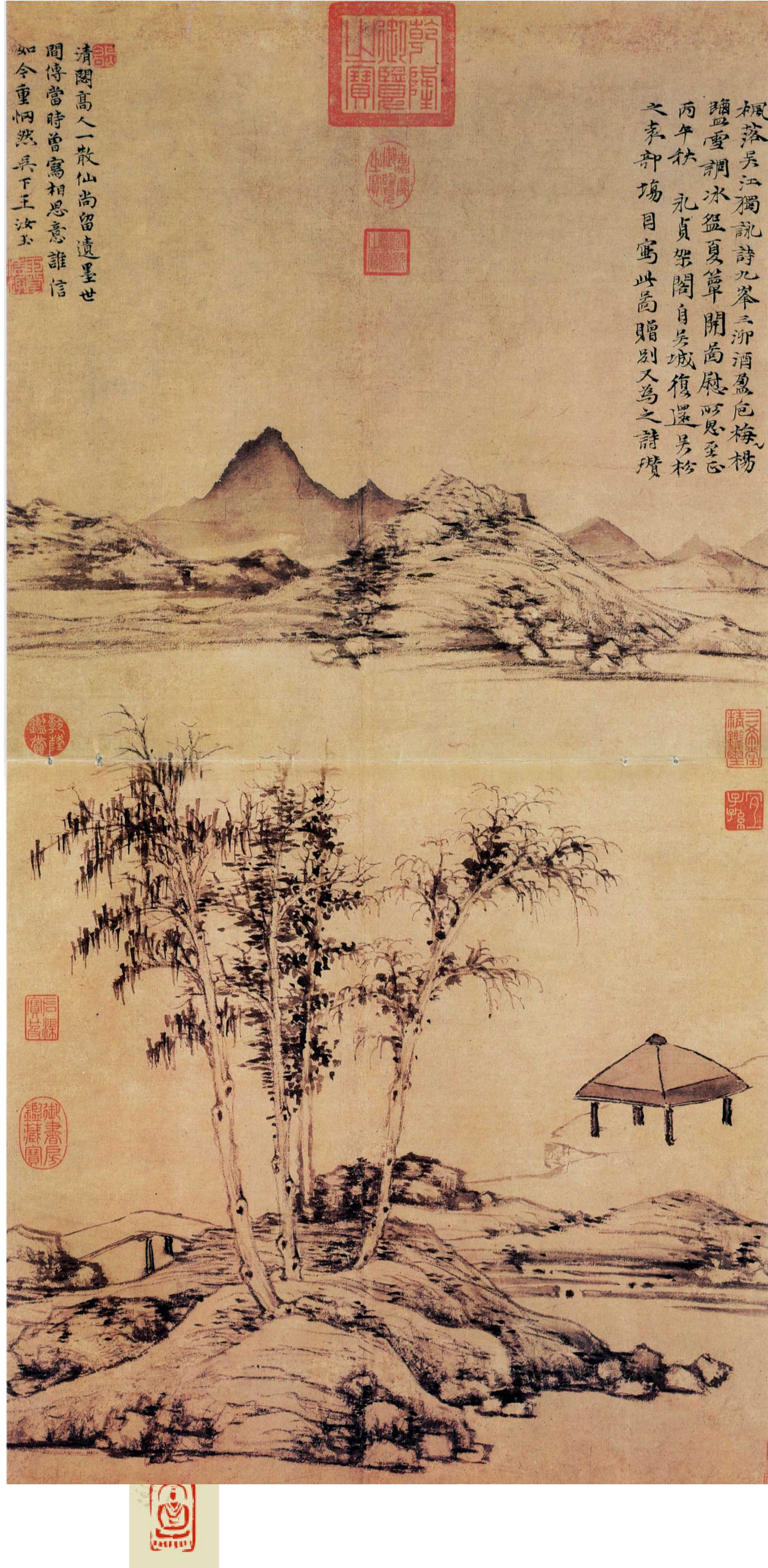這張馬麟的“層疊冰綃圖”, 可以把中國畫的幾個基本要素概括一下: 畫, 字, 章, 以及大量的留白。特別是“層疊冰綃”四字的形容恰如其分,且極富詩意,位置也是極為恰到好處, 整幅畫確實帶有詩樣的情趣, 俊爽中帶著清麗。