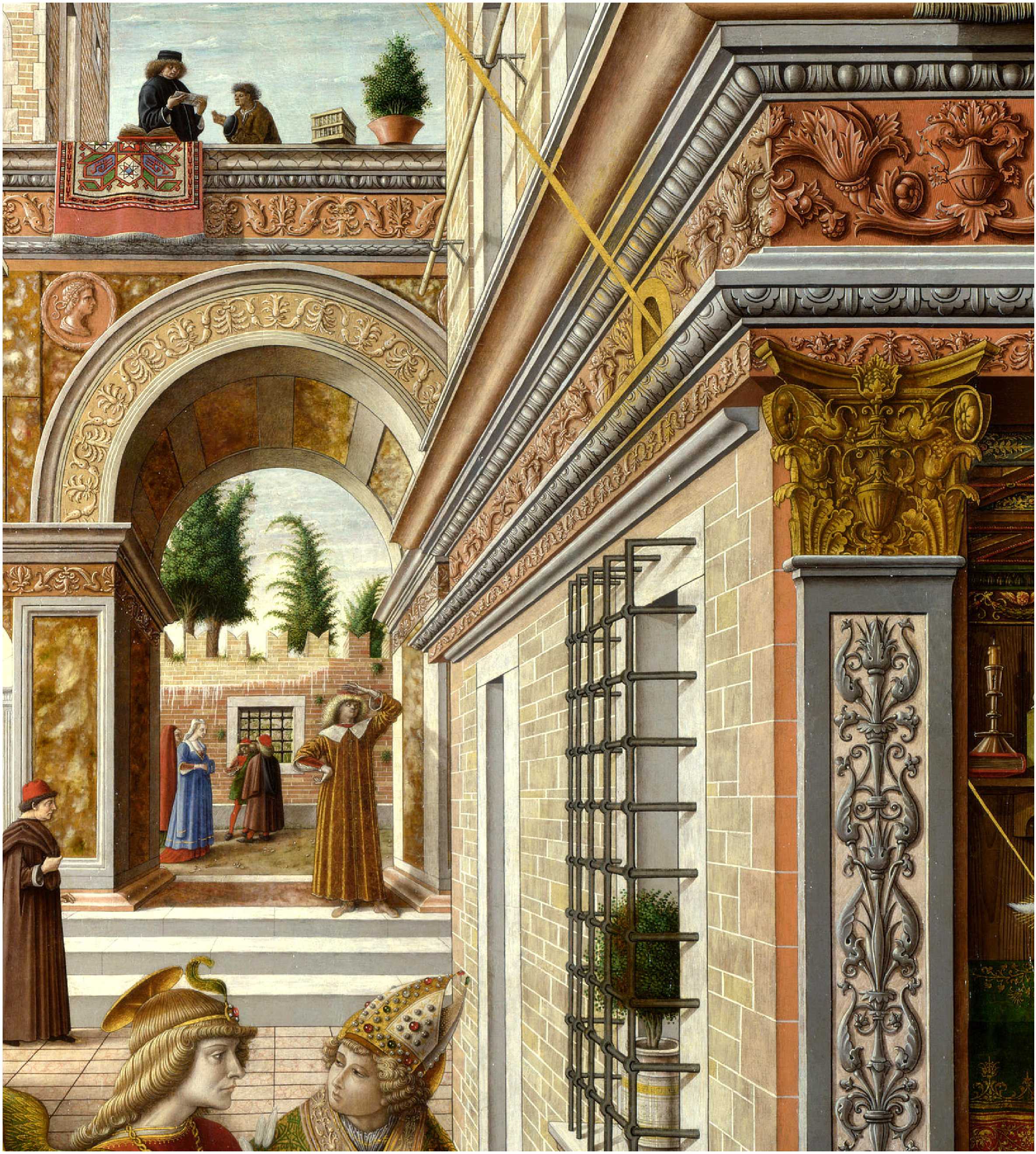 在這里, 我要特別推出一張我非常喜歡的畫作“天使報喜”. 在1482年, 被教皇統(tǒng)治的阿斯科利宣布了獨立。 這是罕見的包括于大天使加百利圣徒在報喜的描述, 圣徒艾米堤烏絲手里亦托著本城的模型一起降臨。本圖有著極為明顯的一點透視, 畫面層次豐富, 寓意多樣。每一個出現(xiàn)的事物都有著特殊的意義, 比如說孔雀代表著瑪麗即將懷孕,前景的蘋果則代表“夏娃”等。