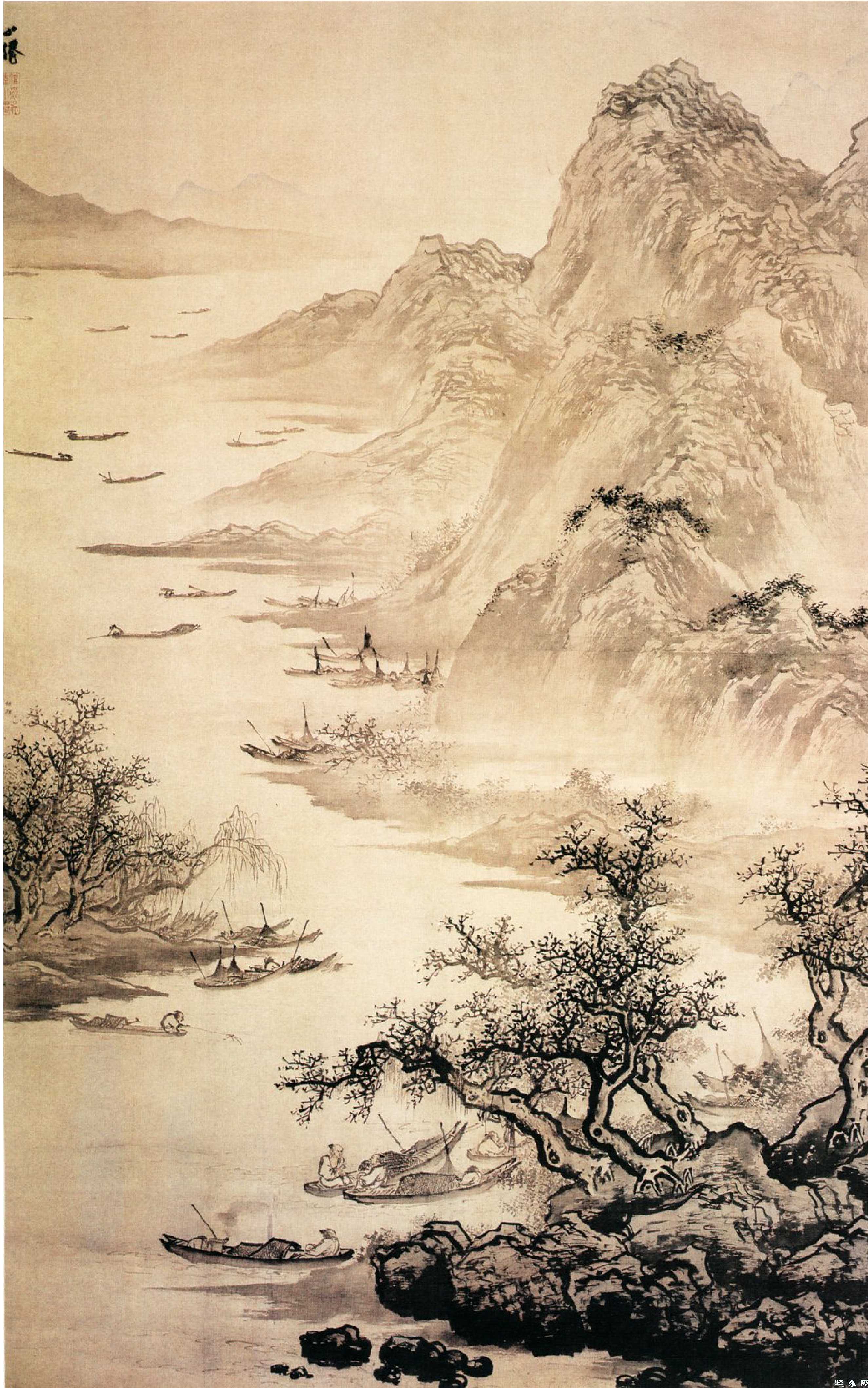 北宋畫家范寬作的舉世聞名的“谿山行旅圖”,選這張圖的目的是中國畫遠(yuǎn)景,中景和近景的關(guān)系。近景, 中景, 遠(yuǎn)景的比例大致為1:3:9,遠(yuǎn)景的山和近景的墨色一樣厚重, 同時遠(yuǎn)山和近景之間未加油墨, 反而襯出虛無縹緲之感, 而遠(yuǎn)山對觀者而言忽遠(yuǎn)忽近, 這就是中國畫中的不定性, 畫以意念為轉(zhuǎn)移。