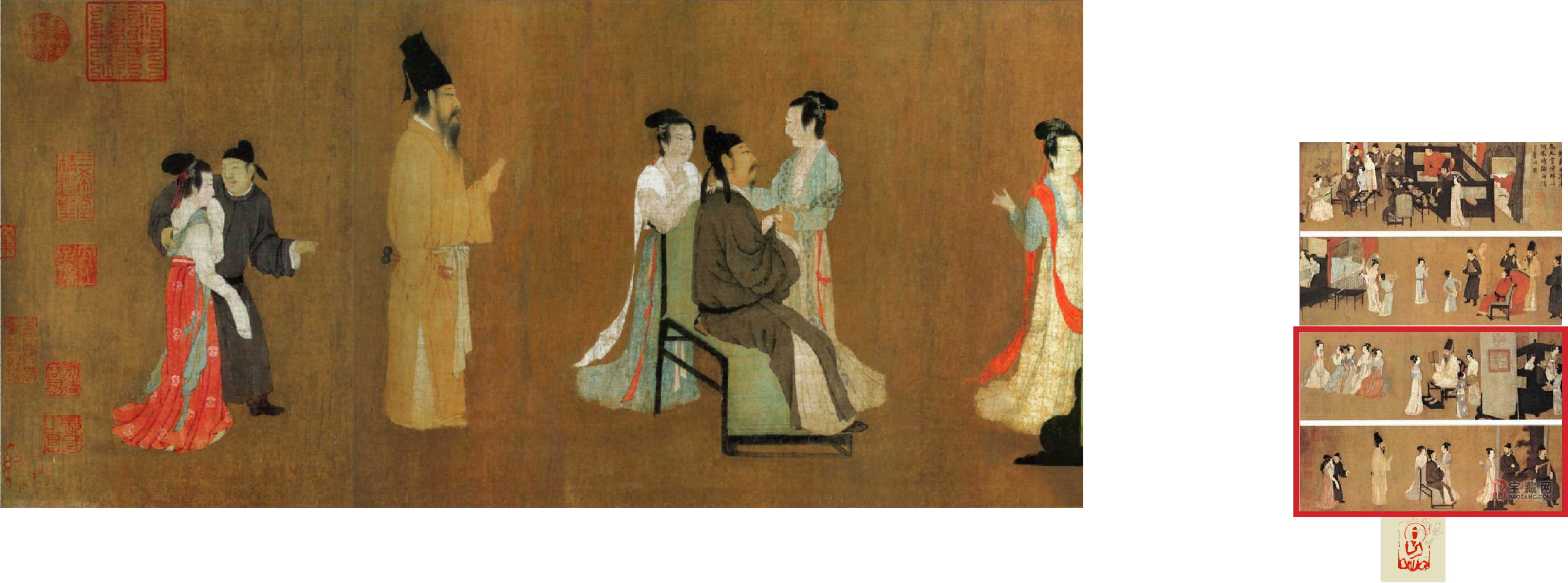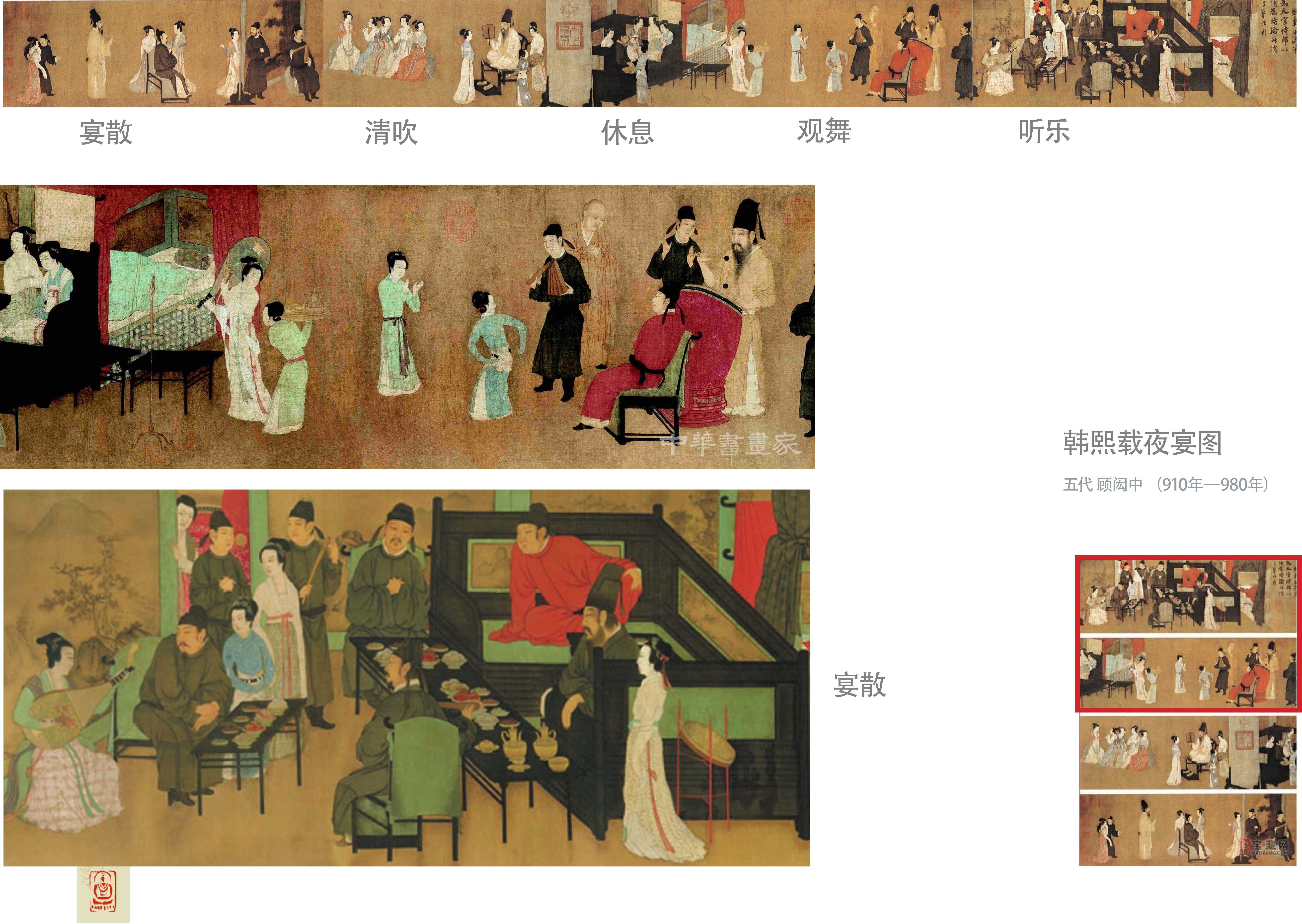 本圖是偵探顧大臣眼識心記后所畫, 可謂間諜情報的畫本。 卷軸中韓熙載出現(xiàn)了5次, 從宴會開始到結(jié)束, 分為聽樂, 觀舞,休息, 清吹和宴散等5部。 橫觀此圖,一個有意思的現(xiàn)象誕生了, 是什么? 原來出現(xiàn)了時間軸。 在一幅靜態(tài)的畫卷中, 插入了動態(tài)的時間, 從二維直接跳躍到四維,可謂獨創(chuàng)。