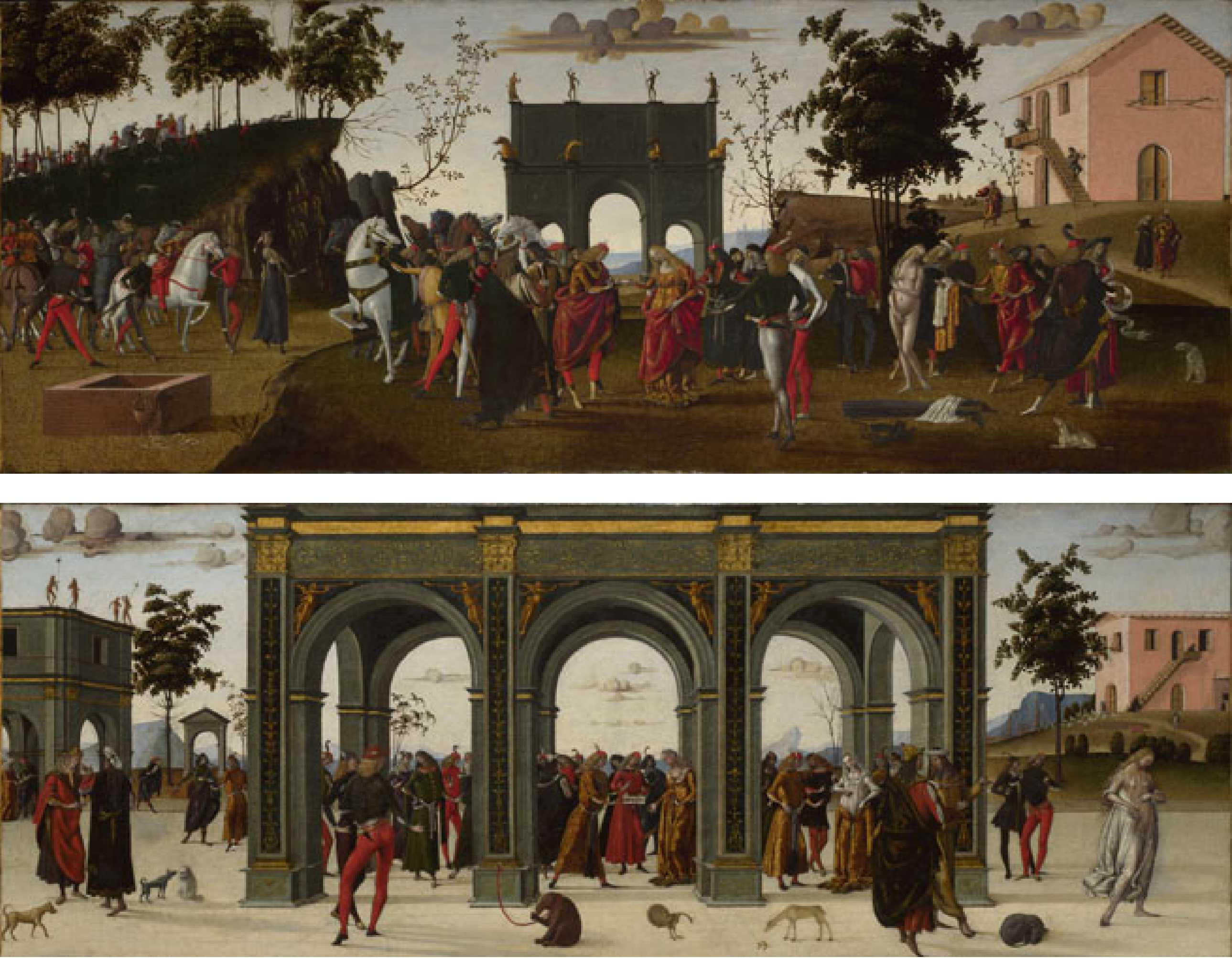 這一套圖從時間的順序上表現(xiàn)出事情的發(fā)展 :結(jié)婚-放逐 -重逢 , 更有意思的是在每張圖中也表現(xiàn)了額外的時間軸:比如說在“結(jié)婚”場景里, 右側(cè)遠(yuǎn)景侯爵牽引著格麗塞達(dá)從農(nóng)舍走出來, 繼續(xù)往左看,格麗塞達(dá)脫掉簡樸的著裝, 赤身裸體, 畫面的中間的格麗塞達(dá)這時已經(jīng)穿上了華服, 到了畫面的最左邊, 他們騎上了馬, 準(zhǔn)備回到侯爵官邸 。在第二幅場景中, 從圖像的中心到右邊表現(xiàn)了伯爵脫掉格麗塞達(dá)的華服并驅(qū)逐她離開的場景。在這每張圖里, 同樣的人物出現(xiàn)了三,四次!這種時間軸套時間軸的做法好像是在翻一本連環(huán)畫書, 敘述性極強。