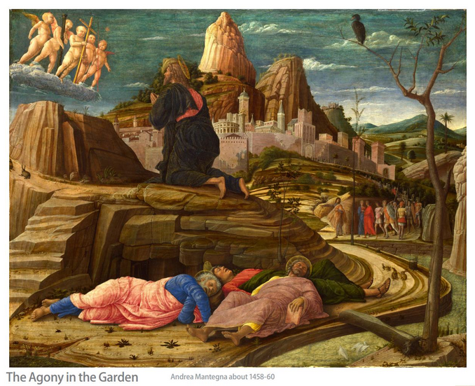 用“花園中的煩惱”用來類比谿山行旅圖。 這張圖也分近景, 中景和遠(yuǎn)景。 前景耶穌的門徒因為勞累而席地而息, 中景中的天使拿著耶穌受難的十字架出現(xiàn)在一個祈禱者面前,遠(yuǎn)方的猶大帶領(lǐng)士兵來逮捕耶穌基督。同時耶路撒冷城則已古羅馬的環(huán)形劇場來體現(xiàn)。在這張圖里, 各個景深層次清晰,路,山體, 人和城池的透視近大遠(yuǎn)小, 構(gòu)圖緊密,圖面意義表達(dá)直鋪, 如果把背后故事讀懂了, 就是這張圖所表現(xiàn)的意義。各個景深構(gòu)圖的方式, 和中國畫的顯然不同, 中國畫對于景深往往用留白來表現(xiàn), 更富有平面設(shè)計效果, 而西洋畫則以透視和油墨填充清楚, 直白清晰。