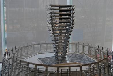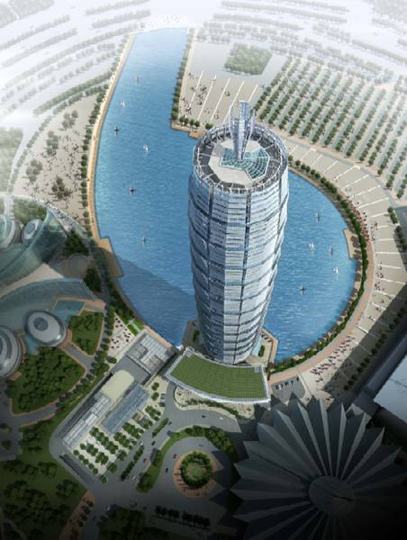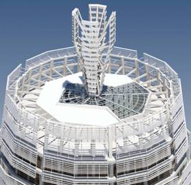 塔樓創(chuàng)意源自于中國古代寶塔嵩岳寺塔,建筑體型呈“紡錘”形。酒店區(qū)核心筒內(nèi)樓板開洞,形成一個約88m深的共享天井,天井頂端天窗上矗立一高約30m的陽光反射器,陽光通過反射器的反射照入天井內(nèi),使得天井可以自然采光。