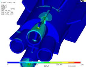 圖7為本結構關鍵節(jié)點之一“箭尾”節(jié)點,反光器的8組高強鋼索均匯交于桁架下部“箭尾”節(jié)點,設計時采用柱狀加加勁肋節(jié)點。經(jīng)ANSYS有限元分析表明節(jié)點處于彈性狀態(tài)。