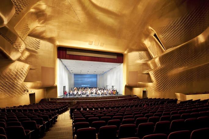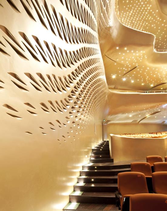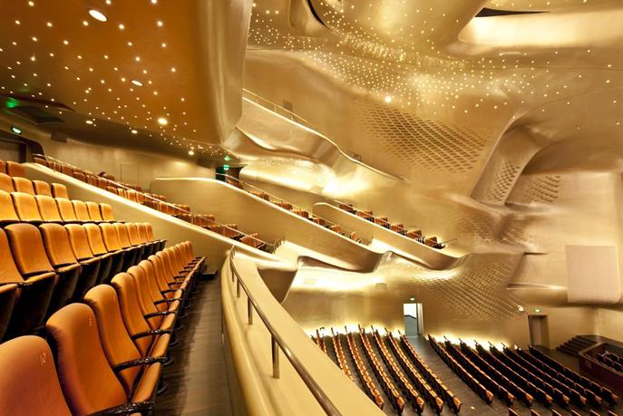 要滿足以上諸多方面的要求,同時又要延續(xù)扎哈的風(fēng)格。中孚泰團(tuán)隊在室內(nèi)設(shè)計中充分理解了建筑的語匯,順勢而為,利用這些異形雙曲面形體構(gòu)成良好的聲學(xué)構(gòu)造,達(dá)成聲學(xué)之美的目的。同時用分解的觀念強(qiáng)調(diào)打碎、疊加、重組,重視形態(tài)、動感、節(jié)奏、韻律、獨特、情境、多元化表現(xiàn)室內(nèi)空間的設(shè)計;以GRG材料的“融力”,以突出自然主題的力量、材料自身的美感和質(zhì)感,又結(jié)合了形式感強(qiáng)烈的現(xiàn)代雕塑語言為結(jié)構(gòu)支撐,彰顯強(qiáng)悍的氣質(zhì),結(jié)構(gòu)嚴(yán)謹(jǐn),充滿氣勢與張力,實現(xiàn)了其“雙手環(huán)抱形”看臺這種不規(guī)則室內(nèi)體形以及“倒八字形”樂池等設(shè)想,有利于聲場的擴(kuò)散和創(chuàng)造音質(zhì)的空間感,保證了世界上僅有的兩個非對稱設(shè)計觀眾廳之一的優(yōu)良音質(zhì)效果。