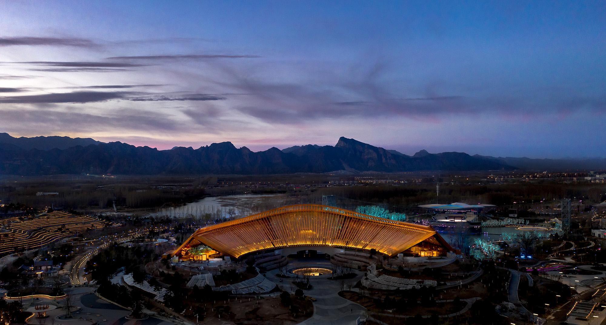 2019年北京世界園藝博覽會(huì)的標(biāo)志性建筑——中國(guó)館,位于山水園藝軸中部,緊鄰中國(guó)展園,北側(cè)為媯汭湖及演藝中心,西側(cè)為山水園藝軸及植物館,東側(cè)為中國(guó)展園及國(guó)際館,南側(cè)為園區(qū)主入口。設(shè)計(jì)從農(nóng)耕文化和中國(guó)傳統(tǒng)哲學(xué)出發(fā),以層疊的梯田肌理為本底,將部分展廳置于地下,輕盈的鋼結(jié)構(gòu)屋頂以龍脊抱月之勢(shì)勾勒出中國(guó)館圓滿溫潤(rùn)的輪廓,既融入自然山水中,又成為園區(qū)的核心和焦點(diǎn)。