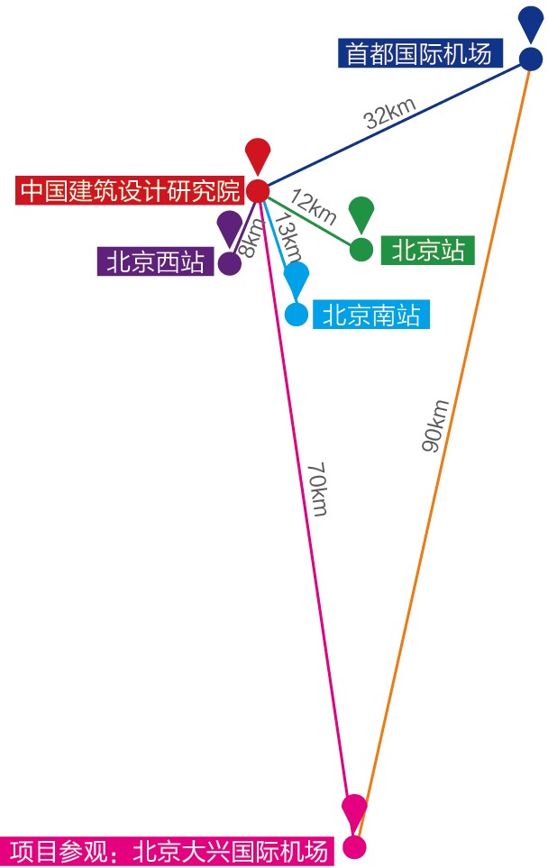 參觀項(xiàng)目(北京大興國(guó)際機(jī)場(chǎng))距離中國(guó)建筑設(shè)計(jì)院約70km,距離北京火車站約65km,距離北京西站約66km,距離北京南站約63km,距離首都國(guó)際機(jī)場(chǎng)約90km。